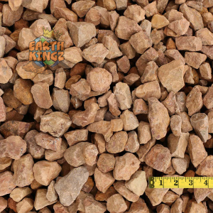 A reddish, angular decorative rock with warm earth tones. Commonly used in landscaping, garden borders, and dry creek beds. Offers a bold, natural look and good contrast with greenery. Does not compact, purely aesthetic.